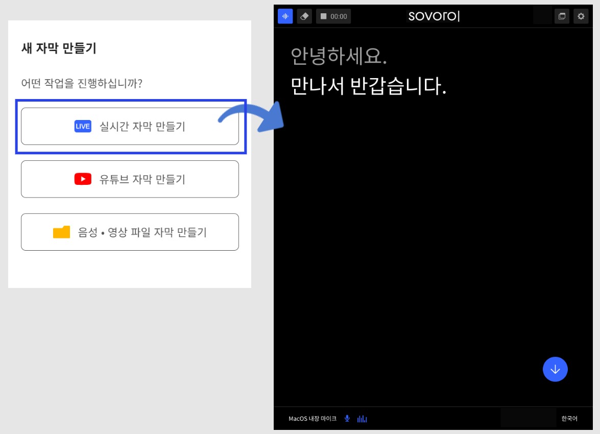 실시간 자막 만들기를 클릭합니다.