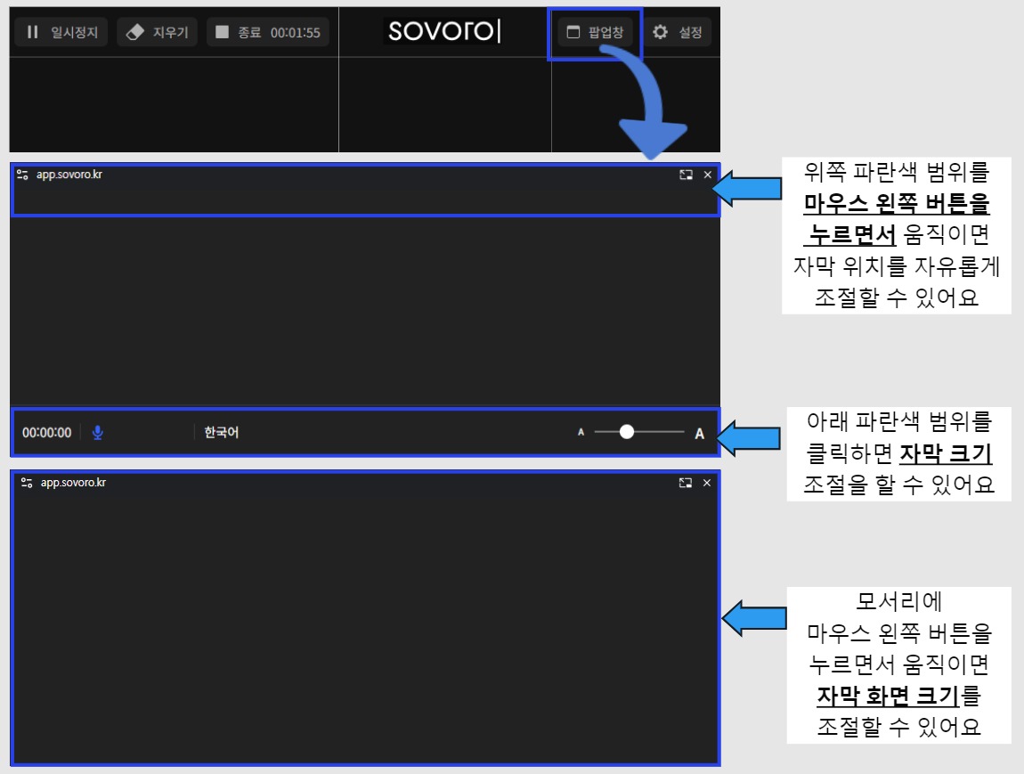팝업 창 기능으로 자막 화면 크기 · 위치를 자유롭게 조절할 수 있어요.
