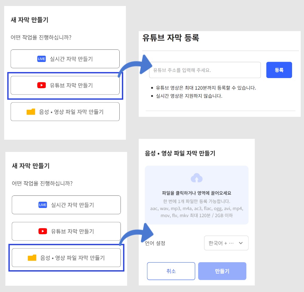 유튜브 자막 만들기를 클릭합니다.음성 파일 자막이 필요한 경우,