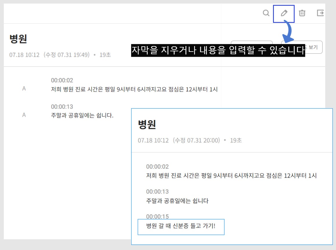 연필 모양의 아이콘을 클릭하면 자막을 편집할 수 있습니다.