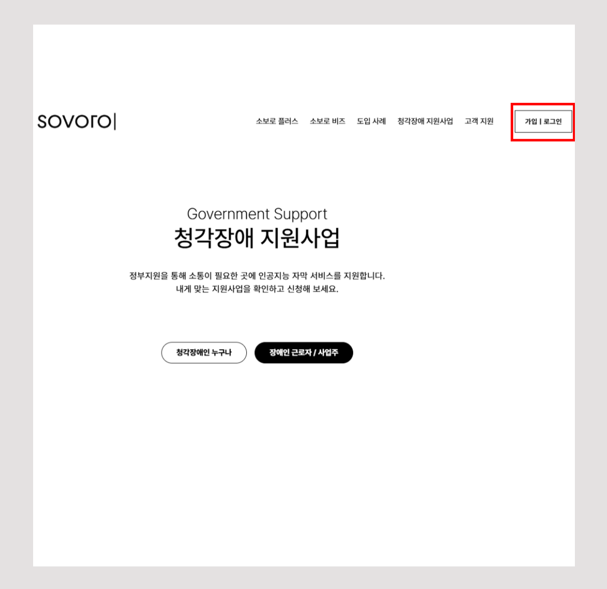 회원가입홈페이지 메인 화면 오른쪽 상단 '로그인/회원가입'을 클릭합니다.소보로 플러스 PC는 소보로 플러스 앱과 연동되기 때문에 앱에서 이미 가입한 분들은 가입한 계정으로 로그인이 가능해요.